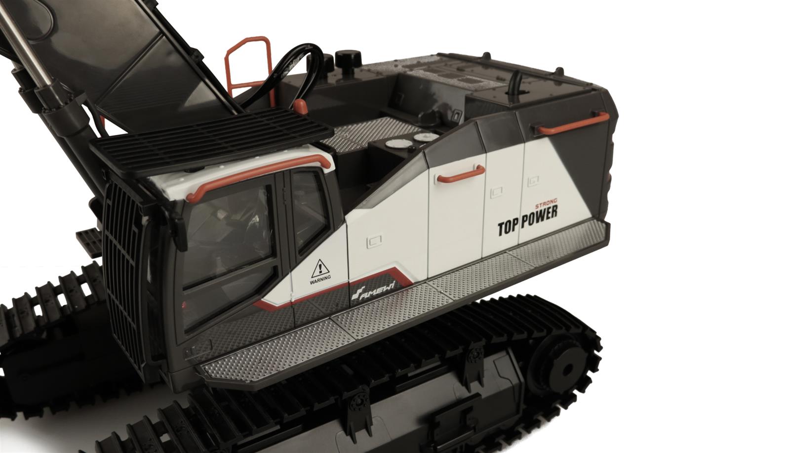 Aufwendiger und hochwertiger Nachbau eines schweren Kettenbaggers. Hohe Detailtreue und hohe Materialgüte. Mit einer echten Eurosteuerung (Knüppel belegt wie im echten Bagger) mit störungsfreiem 2,4GHz System.