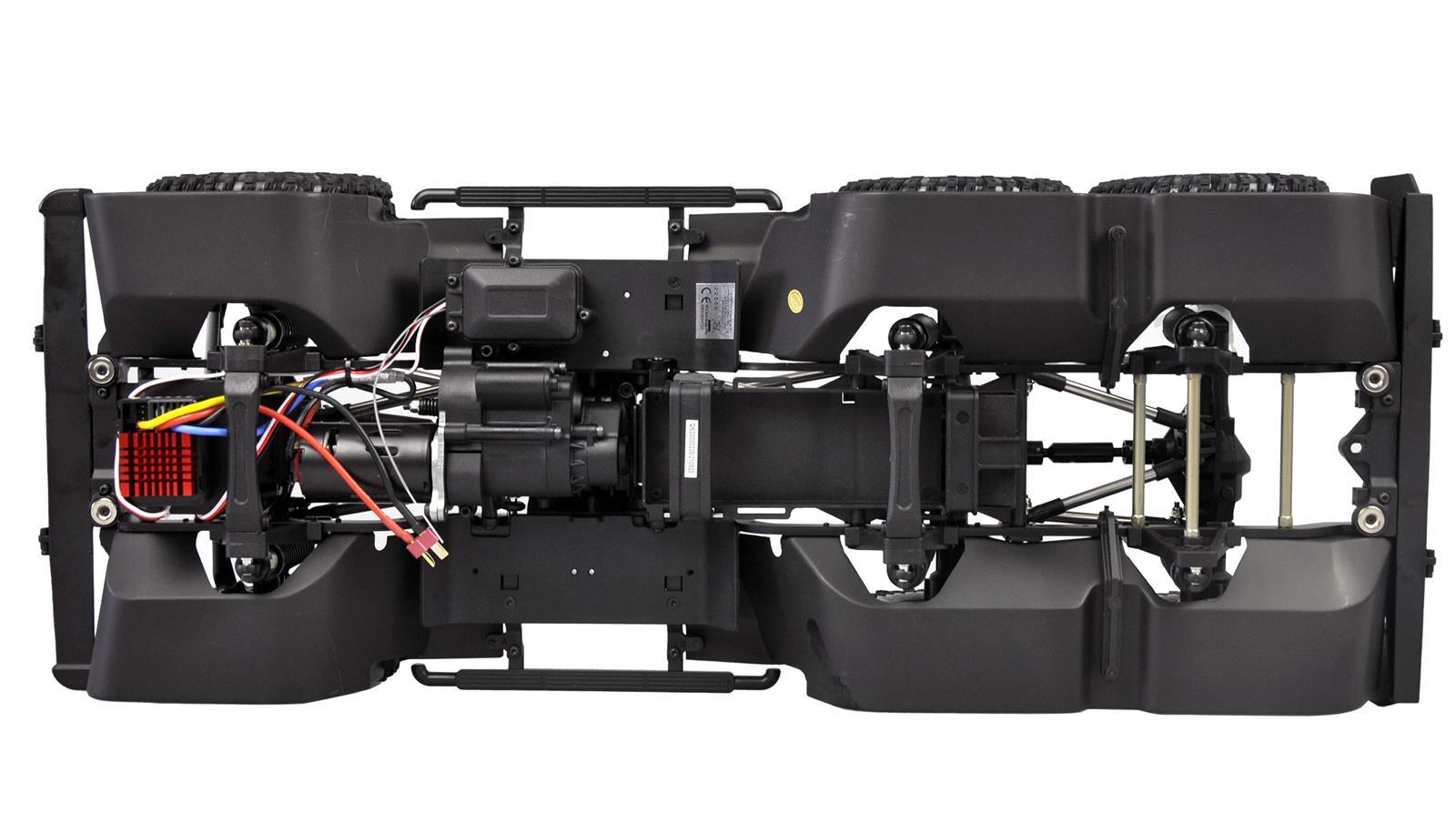 Die im Lieferumfang enthaltene 2,4GHz 4-Kanal Fernsteuerung bedient neben allen Fahrfunktionen zusätzlich das 2-Gang-Getriebe und die vorbereitete LED-Beleuchtung. Das Lenkservo leistet in der Basis-Version bereits 15kg Stellkraft. Das gesamte Modell ist wassergeschützt und trotzt so allen äußeren Einsatzbedingungen.