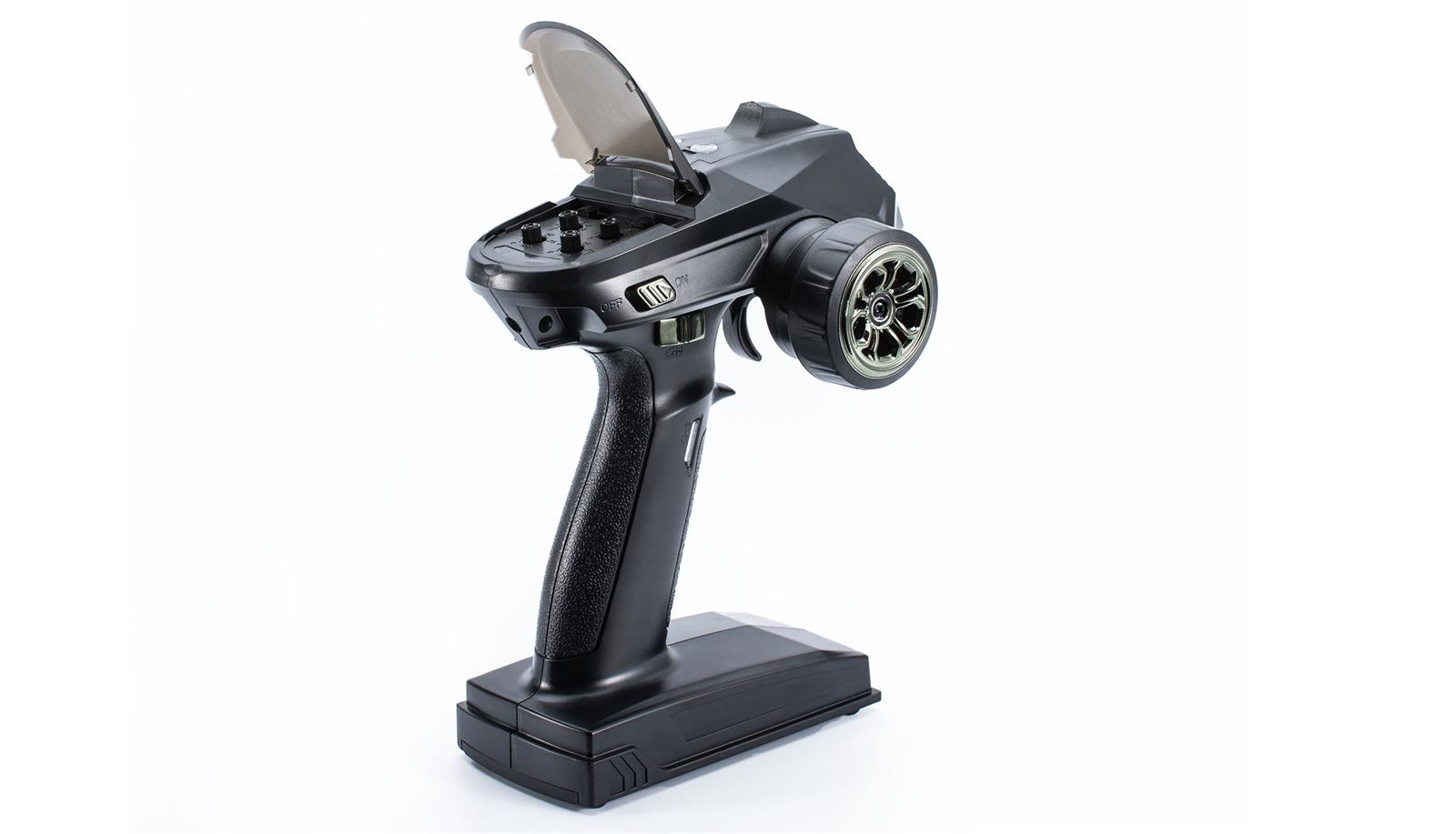 Die im Lieferumfang enthaltene 2,4GHz 6-Kanal Fernsteuerung bedient neben allen Fahrfunktionen zusätzlich das 2-Gang-Getriebe, die Differentialsperren und die LED-Beleuchtung. Das Lenkservo leistet in der Pro-Version 25kg Stellkraft. Das gesamte Modell ist wassergeschützt und trotzt so allen äußeren Einsatzbedingungen.