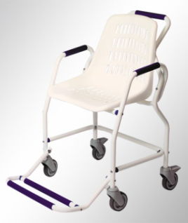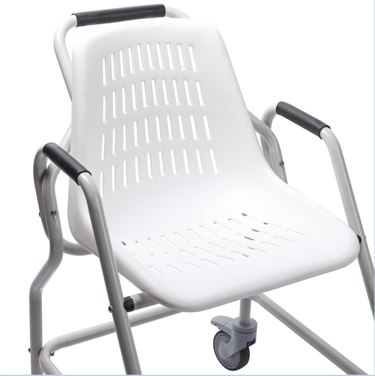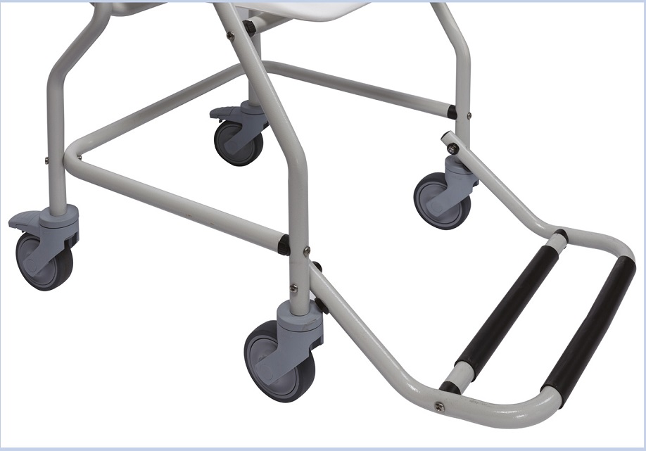 Das Untergestell des Atlantis Duschrollstuhs aus Aluminium ist epoxidbeschichtet und somit rostfrei. Die Sitzfläche ist mit Ablauflöchern versehen, damit Wasser und Seifenreste gut ablaufen können. Die Fußstütze ist absenkbar und die Rollen rostfrei.