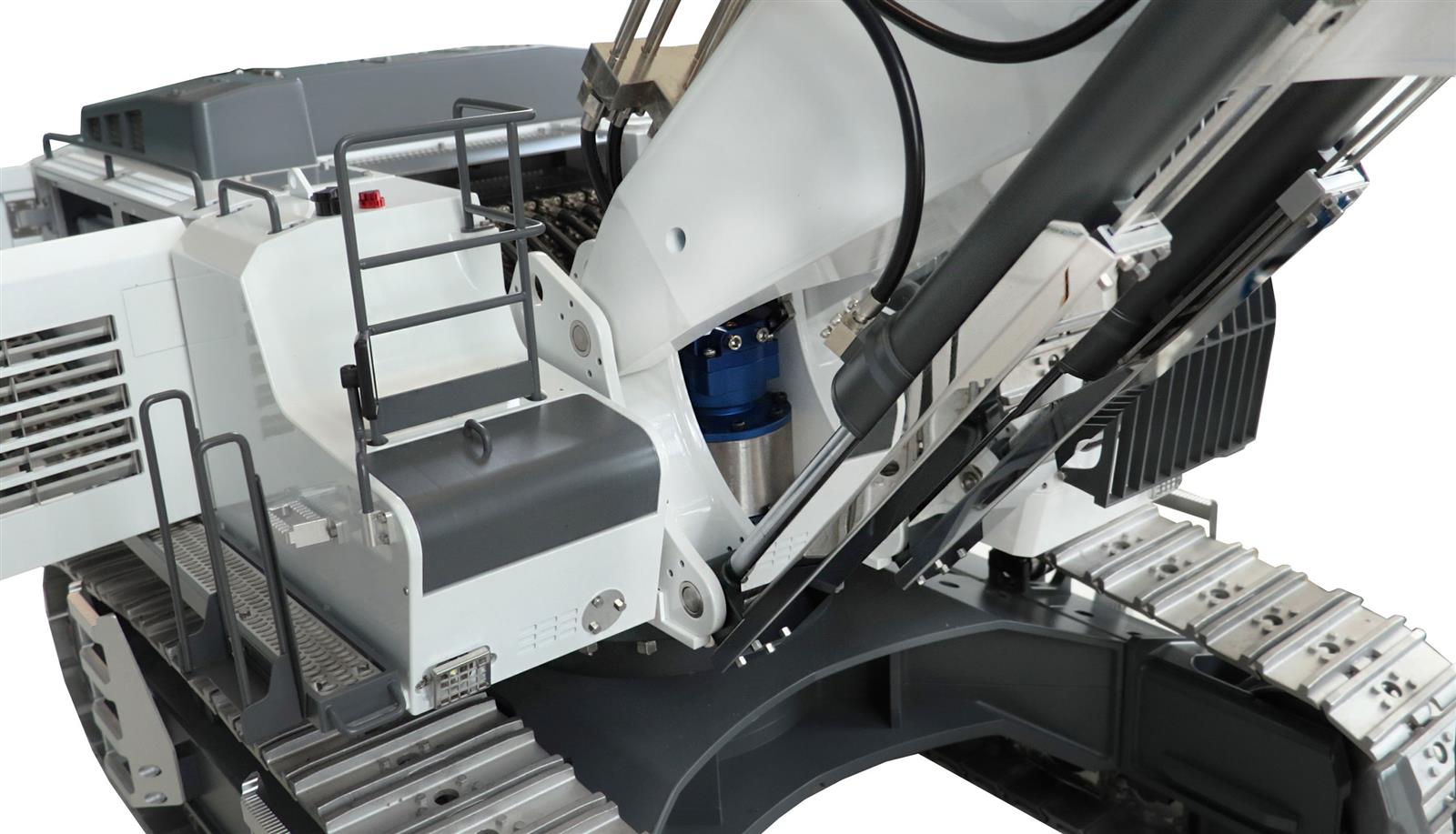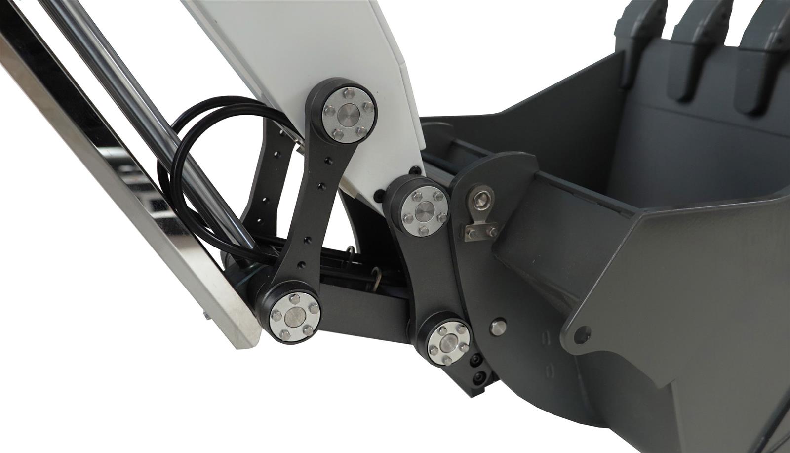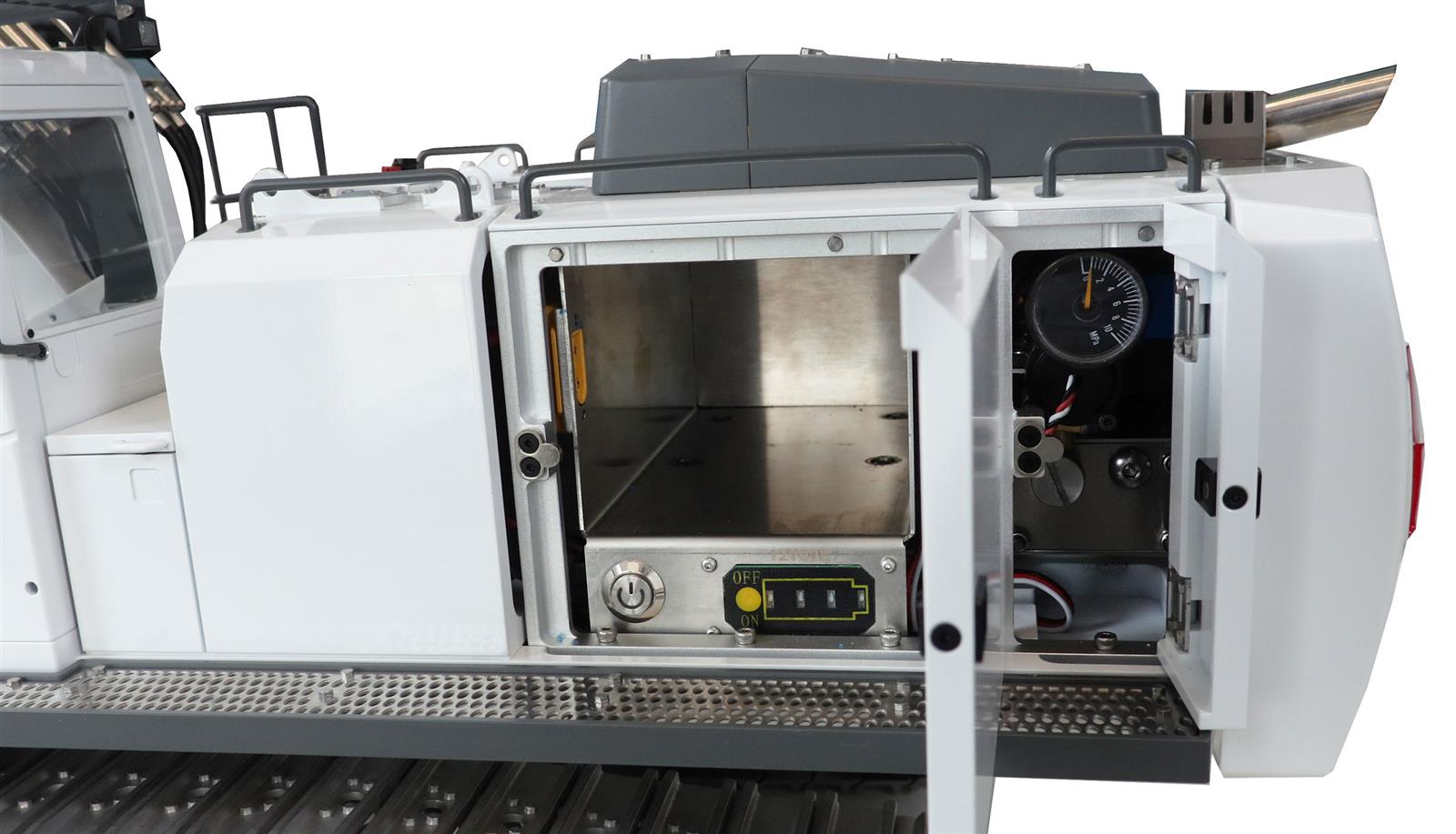 Der Aufbau des Modells mit der gut zugänglichen Hauptelektronik ermöglicht den Einbau eines optionalen Rauchmoduls unter der hinteren Abdeckung – der passende Auspuff dafür ist schon serienmäßig verbaut. Zusätzlich sind zwei weitere Hydraulik-Kreisläufe am vorderen Ausleger des Modells untergebracht, um optionale Arbeitsgeräte wie z.B. eine Hydraulik-Schere o.Ä. direkt anschließen zu können.