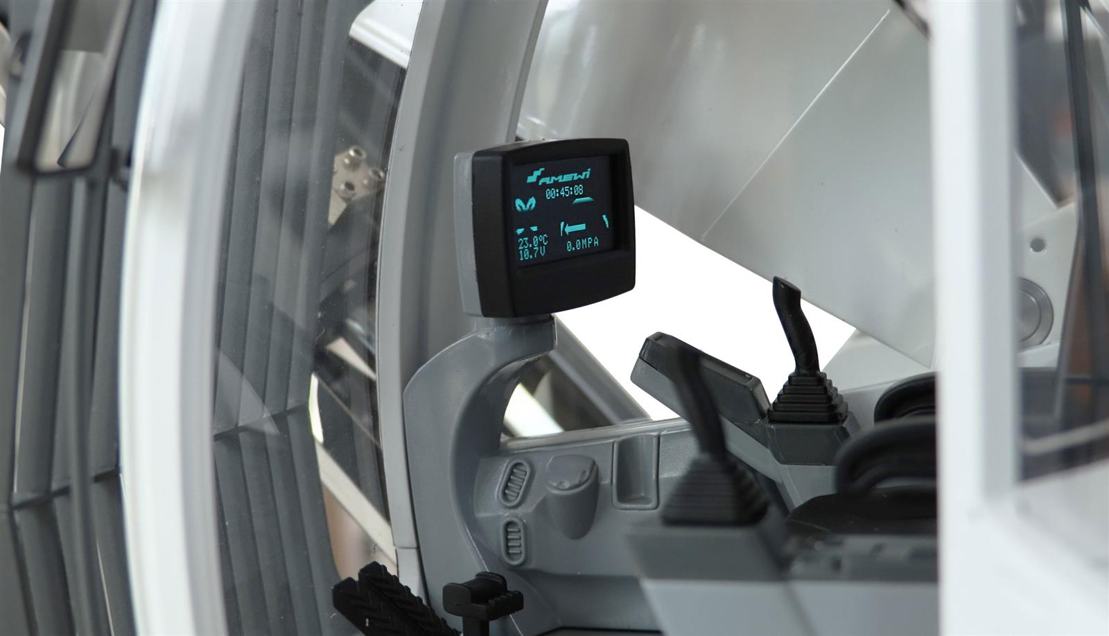Ein Vollmetall-Kettenbagger der Superlative, der als RTR Modell und exklusive Amewi Edition mit einer bisher nicht gekannten Qualität im enormen Maßstab von 1:13,5 (gemessen) und 30,8kg Gewicht angeboten wird. Dieser Super Scale Nachbau eines 70t Baggers steht dem Original in nichts nach – alle Funktionen, alle Anbauteile und selbst der Cockpit-Ausbau sind bis ins kleinste Detail dem großen Bruder nachempfunden. In der Scale Kanzel ist sogar ein LCD-Display untergebracht, welches Echtzeit-Telemetriedaten wie Akkustand, Temperatur, Laufzeit und aktuellen Arbeitsdruck anzeigt. Letzterer beträgt dabei je nach Arbeitszustand bis zu 33bar. Bereits in der Herstellungsfabrik wurde der gesamte Hydraulik-Kreislauf auf Dichtigkeit mit ca. 60bar Druck geprüft.