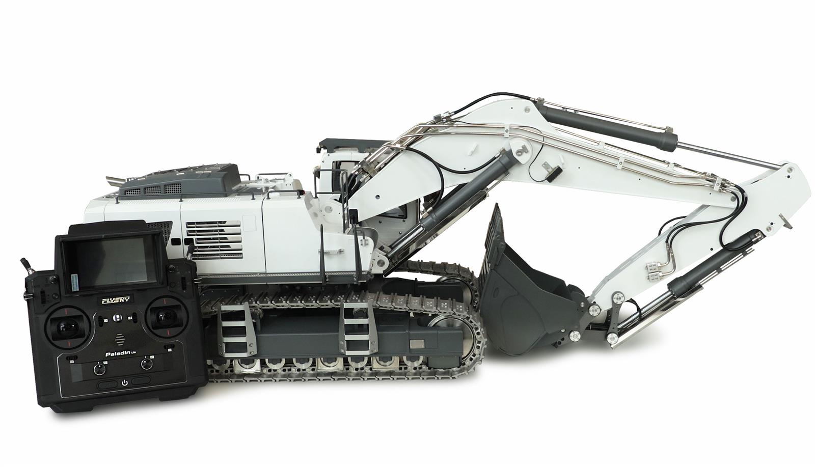 Der G308H ist aus Vollmetall gefertigt und bringt fahrfertig stolze 30,8kg auf die Waage. Die Stellkraft der Ausleger liegt bei etwa 30kg und das Fassungsvermögen der massiven Schaufel beträgt ca. 1,3l. Wer sehr viel Material bewegen möchte, findet hieran wahre Freude. Die Ausleger inkl. des Löffels lassen sich ca. 0,5m nach unten bewegen. Alle Funktionen sind dabei sehr feinfühlig steuerbar und vermitteln ein sehr angenehmes „Arbeitsgefühl. Der Antrieb des Baggers ist mit einem hochwertigen Brushless-Motor ausgestattet und ermöglicht realistische Fahrzustände inkl. originalgetreuem Sound wie z.B. Kettengeräusch, Hydrauliksound (Arbeitsgeräusch) und Motorsound. Der Drehkranz des Modells und auch das modulare Hydraulik-Kreislaufsystem werden ebenfalls von hochwertigen Brushless-Motoren betrieben. Die gesamte Hydraulikeinheit ist mit hochpräzisen Servos ausgestattet, die den Durchfluss der Ventile steuern. Das gesamte Hydrauliksystem wird durch einen CNC-gefrästen Aluminiumkühler und einen sehr hochwertigen Ölfilter unterstützt, um das Hydraulik-Öl sauber und bei passender Temperatur zu halten. So steht einem ungetrübten, einzigartigen Fahrerlebnis nichts mehr im Wege. Der ebenfalls mitgelieferte Li-Ion Akku 3S 11,1V 15.000mAh sorgt dabei für ausreichend Fahr- und Betriebszeit.