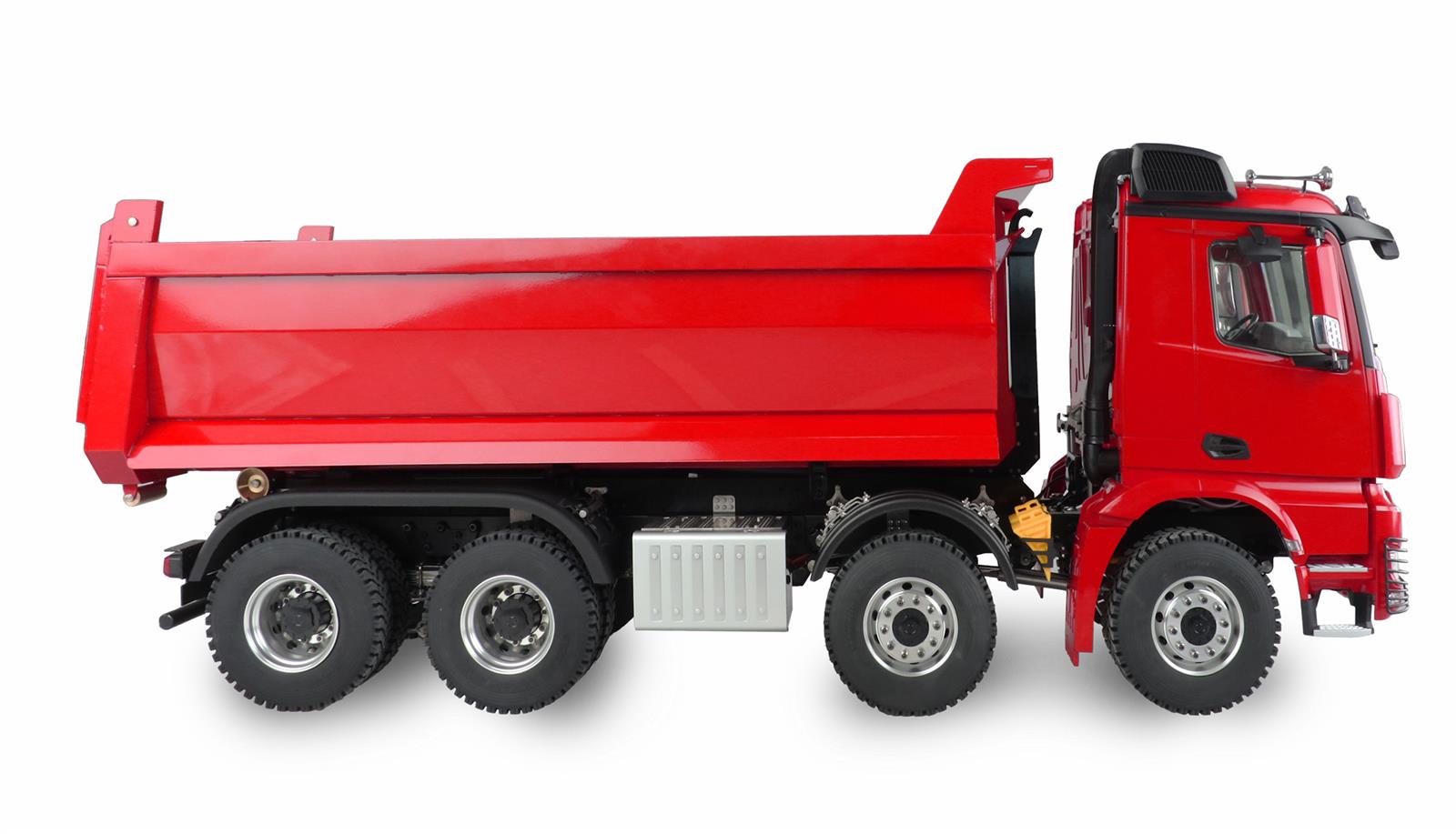 Der gesamte 8x8 Antrieb des Fahrzeugs ist aus Metall gefertigt, genauso wie beispielsweise das Chassis, die Mulde, die Anbauteile, der Tank, die Felgen. Die Hinterachsen sind mit einer profilierten Zwillingsbereifung ausgestattet, die beiden lenkbaren Vorderachsen mit einfachem Profil. Als Federung dient hier eine Blattfederung und die Hinterachsen sind als Pendelachse ausgelegt.