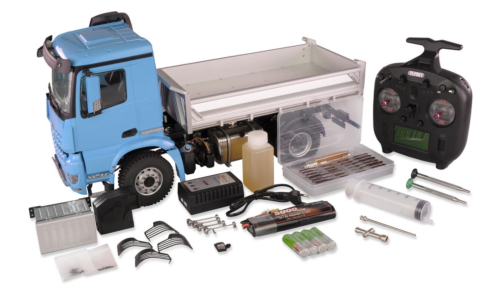 Exklusiver Lizenz-Lkw aus der Mercedes AROCS-Serie, der als 4x4 Modell mit hydraulisch betriebener Kippfunktion besticht und dank Scale-Optik im Maßstab 1:14 den Puls von Modellbauern höherschlagen lässt. Alle Funktionen des Fahrzeugs, das 7,2kg auf die Waage bringt, können über den Sender gesteuert werden. Chassis, Mulde, der gesamte Antriebsstrang und alle Wellen bestehen aus Metall. Für maximale Haltbarkeit der Komponenten ist also gesorgt. Die Scale Fahrerkabine mit vollständigem Interieur sowie die Scale High-Grip Gummibereifung inkl. Scale Felgen aus Metall runden das hochwertige Aussehen ab.