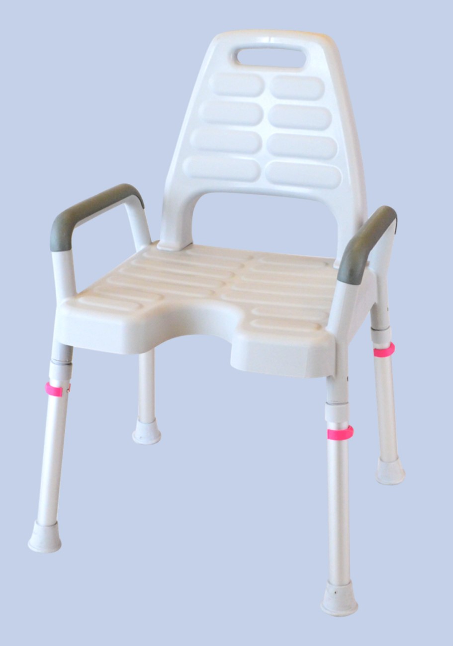 Der Hygieneausschnitt im vorderen Bereich der Sitzfläche erleichtert die Intimpflege und sorgt dafür, das der Nutzer länger selbstständig bleibt. Der Duschhocker steht in allen Positionen fest und ist trotz seines geringen Gewichts bis zu 150 kg belastbar. Die stabilen Armlehnen bieten Sicherheit für den Benutzer und erleichtern das Auf- und Absitzen.
