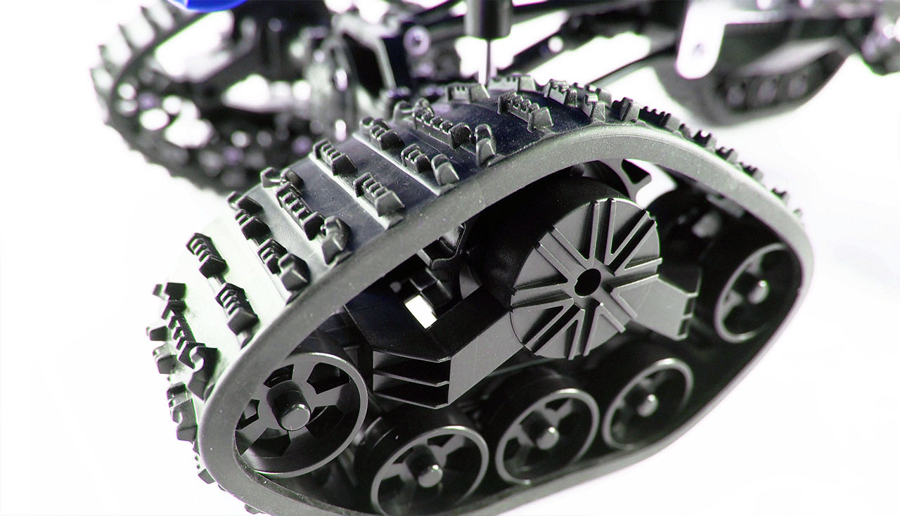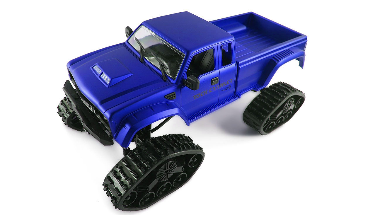 1:16 Pick-Up Truck blau mit Kettenfahrwerk und einem zusätzlichem Räderset. Dieser tolle Truck mit seinen 34cm Länge und dem starken Antrieb fühlt sich dank dem mitgelieferten Kettenfahrwerk und dem 4WD Antrieb im Gelände erst richtig wohl. Auch Schnee und Matsch stellen dieses Modell vor keine großen Herausforderungen. Die spritzwassergeschützte Elektronik und das 2,4Ghz Steuerungssystem sind weiter Highlights dieser Fahrzeugserie. Weitere Ausstattungsmerkmale sind z.B. ein Metallrahmen, hochwertige Verarbeitung und ein sehr schönes Fahrgefühl.