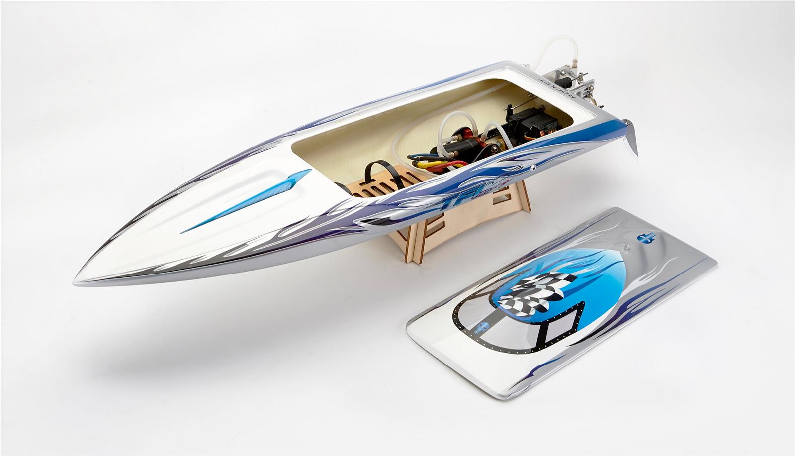 Die beliebte Rocket komplett überarbeitet und in einem neuen Design.Neue stylische OptikHochwertiger Schiffsrumpf aus Fiberglass. Perfekt abgestimmtes System mit einer Kombination aus wassergekühltem 2858KV brushless Motor und einem 70A ESC (Regler) für hohen Topspeed. Das Racing-Boot läuft wie auf Schienen und saugt sich durch jede Kurve. Unkompliziertes Handling. Die zwei Turnfins können bei Rechtskursrennen für noch mehr Speed hochgeklappt werden. Finnen und Schiffsschraube (2-Blatt) aus CNC- gefrästem Metall. Das Boot lässt sich entweder mit einem Reglementskonformen 3S Mono Akku fahren oder mit einem 4-Zellen LiPo für extreme Power.Technische Daten:Motorart: 380er Brushless, 2858KV wassergekühltECS: 70A wassergekühlt, Deans T-SteckerAkku: 3-4 Zellen LiPo ab 3300mAhAbmessung (L x B x H): 650 x 200 x 110mmGewicht: 1100gFernbedienung: 2-Kanal 2,4 GHzSchiffsrumpf aus FiberglassLieferumfang:Rocket Racing BootFernbedienung FS-GT2E mit 2,4 GHzBootsständerMontageschlüssel1 Rolle Klebebandausführliche, bebilderte BedienungsanleitungBenötigtes Zubehör:3-4 (11,1V - 14,8V) Zellen LiPo ab 2100-4500mAh LiPo mit Deans T-Stecker wird noch benötigt4x 1,5V Mignon AA Batterien benötigt>>>>GPSR>>>AMEWI Trade GmbH ;Nikolaus-Otto-Str. 18;D - 33178 Borchen;Tel.: +49 5251 288965-0;E-Mail: info@amewi.com ;Web: www.amewi.com